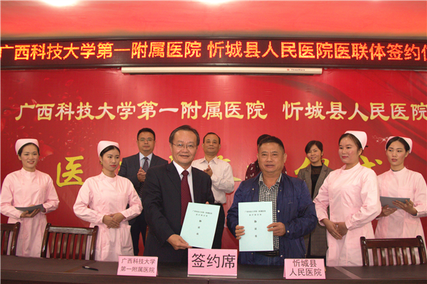 10月31日上午,忻城县人民医院与我校第一附属医院医联体签约暨揭牌仪式在忻城县人民医院举行。忻城县卫计局局长蓝小鲜、副局长韦凤玲,我校第一附属医院院长谢苇,副院长兰鹰、覃天、闭雄杰以及忻城县人民医院院长莫益福、忻城县人民医院全体科主任、护士长参加了签约仪式。签约仪式由忻城县人民医院副院长罗伟主持。