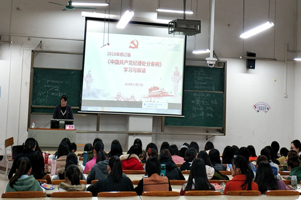 11月23日下午,由财经学院党委纪检委员廖霄梅,在第六教学楼北103教室,给学院学生党员进行了宣讲——《〈中国共产党纪律处分条例〉学习与解读》。廖霄梅对《条例》内容的变迁、创新之处进行了详细解读,强调了《条例》修订的政治性,强调《条例》全面贯彻习近平新时代中国特色社会主义思想和党的十九大精神,并对党的六大纪律中新增的内容进行深入阐释。