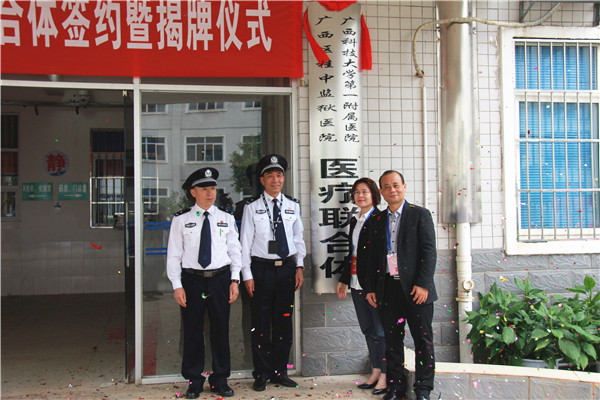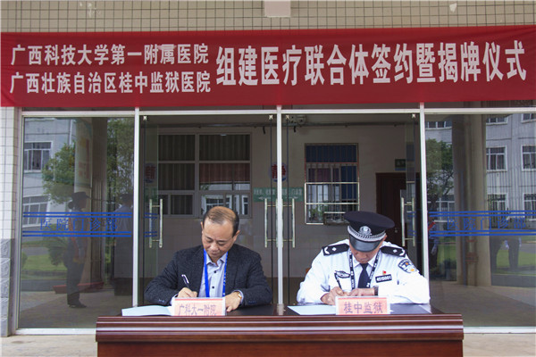 5月8日上午,广西桂中监狱医院、广西科技大学第一附属医院医联体签约揭牌仪式在广西桂中监狱医院举行。参加签约揭牌仪式的领导有广西桂中监狱监狱长陈拥军、政委黄建勋、副监狱长韦柳军、李春萌、我校第一附属医院党委书记覃莲、主持行政工作的副院长覃天,以及广西桂中监狱干警、医务人员、第一附属医院医疗专家团队。签约及揭牌仪式由李春萌主持。