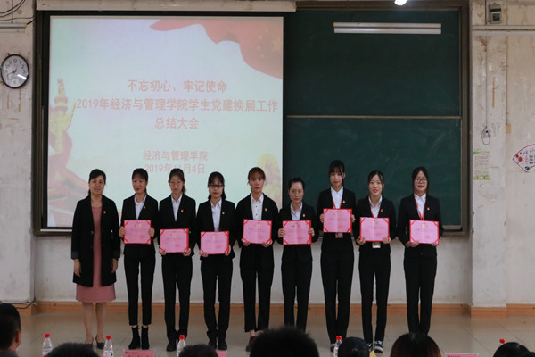 11月4日,经济与管理学院2019年学生党建换届工作总结大会在第四教学楼四阶一教室举行。经济与管理学院党委书记廖奕,党委副书记、纪委书记韦齐齐,党委副书记陈学智以及各学生党支部书记参加了会议,新老两届学生党员干部以及全体学生党员参加了会议,本次大会由学院团委书记、党办主任翁文雯主持。