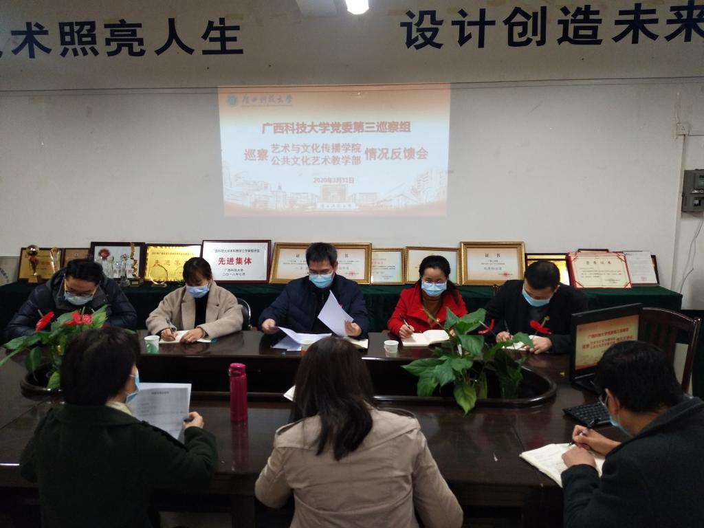 3月31日上午,校党委第三巡察组巡察情况反馈会在艺术学院会议室召开。巡察组全体人员、学院领导班子、学院中层干部、教职工代表等30人参加了会议。会议由学院党委书记叶雁冰主持。