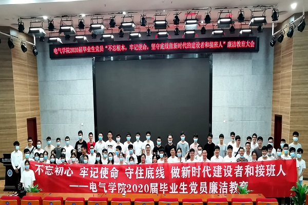 为进一步增强毕业生党员的党性修养和廉洁自律意识,引导他们走好职场第一步,6月12日下午,电气学院组织2020届毕业生党员开展“不忘初心、牢记使命、守住底线,做新时代建设者和接班人”廉洁教育主题活动,电气学院纪委委员盘九保以“不忘根本,牢记使命,坚守底线,做新时代的建设者和接班人”为题,为即将走上社会岗位的毕业生党员同上廉洁教育课。学院党委副书记、纪委书记蒋智华参加活动并讲话。