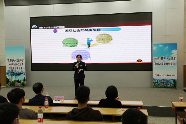 陈静用生动明了、通俗易懂的讲解方式,对当前国内外的毒情形势、毒品产地、新型毒品的隐蔽性以及禁毒的必要性等内容作了详尽介绍,同时还结合广西查毒、缉毒工作案例,深入浅出、图文并茂地给禁毒志愿者上了一堂禁毒知识教育课。陈静希望大学生们能够积极发挥在禁毒工作中的生力军作用,做好禁毒宣传员,以“星星之火,可以燎原”之势深入社区、农村、居民家中,向广大群众宣传禁毒知识,进一步提升群众识毒、防毒、拒毒、禁毒意识和能力,助力打赢禁毒人民战争。