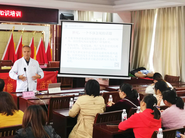 10月10日至10月28日,由柳北区总工会组织的周末职工健康大讲堂,共举办了4期,主题为猝死防治知识、心肺复苏及海姆立克急救法训练。由广西科技大学第一附属医院急诊科韦建革主任、陈新副主任分别对职工们关注的“猝死”问题进行了详细的讲述,以急诊科救治的一个个活生生为案例,告诫柳北区干部职工“猝死”重在预防。嘱咐大家要养成健康生活方式,拒绝烟酒,避免熬夜过劳,同时要保持平和心态。急诊科的医生们还叮嘱大家,即使是运动也要量力而行,不要逞能,而高血压、糖尿病、高血脂不能置之不理,要提高认识,遵医嘱规范治疗。韦建革主任特别提到,有以上诱因的个别人,如果有突然发生的胸痛、胸闷、头昏、黑朦、出冷汗,甚至牙痛、胃痛等情形,可能是心脑血管出现“急症”,很可能是急性心肌梗塞、脑梗塞的早期表现,一方面尽量保持镇定,避免活动,同时要及时打120急救电话,请求医师上门救治,由医护人员陪护下及时转运到医院进一步治疗。他要求职工们掌握心肺复苏基本技能,紧急情况下并加以救治。