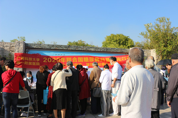 为响应第14个“联合国糖尿病日”,推进糖尿病防治工作,我校第一附属医院内分泌科于11月14日组织高水平医疗专家团队到柳北区雀儿山公园红豆广场,面向社会举办“联合国糖尿病日”暨“蓝光行动”大型公益义诊活动。