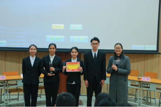 经过激烈的角逐,经济202班代表队获得了本次辩论赛的冠军,会计202班代表队获得了亚军,国贸202班代表队和财务201班代表队获得季军。正方三辩窦小柔荣获最佳辩手的称号。