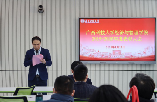 1月15日,经济与管理学院2019-2020年度教职工表彰大会在学院多功能实验室4D403举行,全体教职工参加,表彰会由学院党委副书记、纪委书记韦齐齐主持。