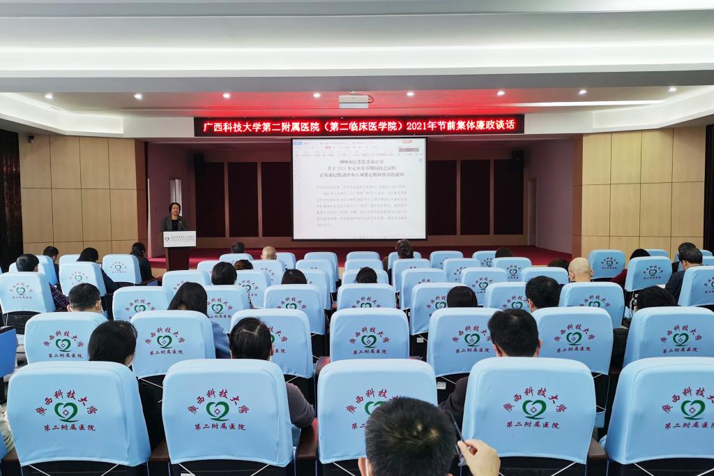 为营造风清气正的节日氛围,2月4日下午,广西科技大学第二附属医院(第二临床医学院)党委副书记、纪委书记邓燕在医院周会上,对全院中层干部进行节前集体廉洁谈话。