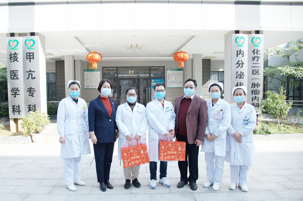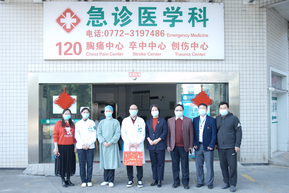 2021年春节大年初一早上,广西科技大学第二附属医院党委副书记、纪委书记邓燕,副院长潘斌代表医院党政领导班子,走进各临床、医技和后勤科室,慰问春节期间坚守在一线的医务人员。慰问组一行先后来到门诊大楼、住院综合楼、放疗科住院大楼、内科病区和核医学实训楼,向各科室值班人员致以新春的问候和祝福。