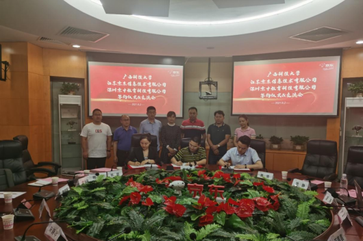 在与会人员见证下,卢志平代表广西科技大学,杨程代表江苏京东信息技术有限公司,宋仁仙代表深圳京才教育科技有限公司,共同签署了三方战略合作协议。签约座谈交流后,考察组一行参观了京东宿迁总部一期、二期的客户服务中心、电教室、培训中心、大数据中心、员工住宿公寓、京东技师学院创新创业孵化中心等。