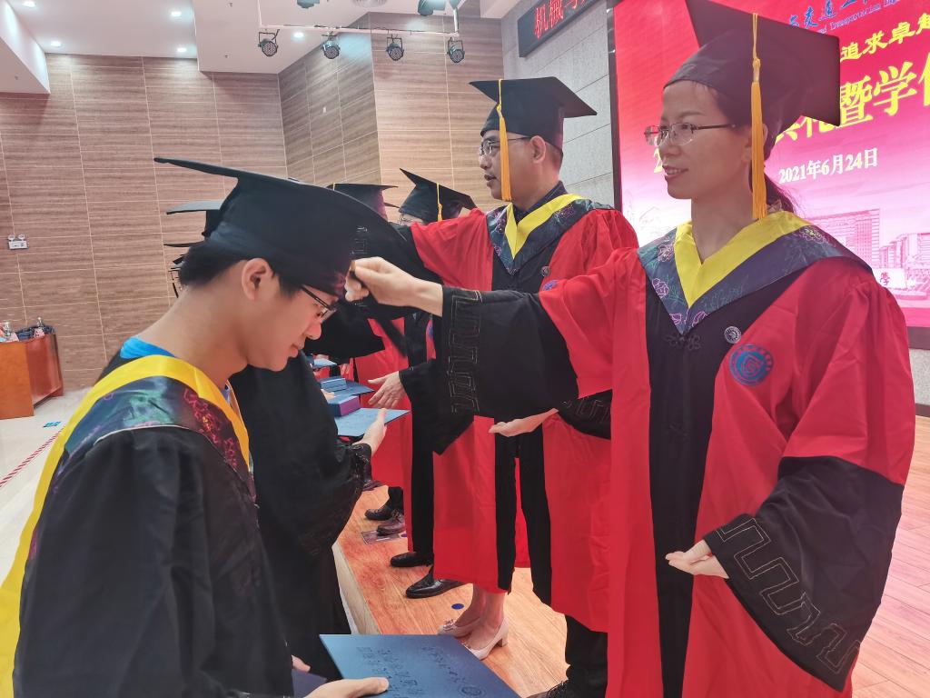 在最引人瞩目的学位授予仪式环节中,毕业生们身着学位服,在欢快喜悦的《成功之路》音乐声中,昂首阔步走上主席台,由学院教授委员会成员、专业系主任、教授代表组成的导师团,依次为学院2021届的400多名硕士、本科毕业生代表颁发了学位证书,拨穗正冠、握手祝贺、赠送毕业礼物并合影留念。