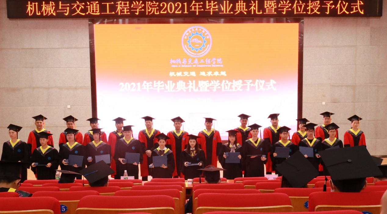 “同学们,大家起来,担负起天下的兴亡……我们今天是桃李芬芳,明天是社会的栋梁……”,简朴而庄重的机械与交通工程学院2021届毕业典礼暨学位授予仪式在《毕业歌》中圆满落下帷幕。
