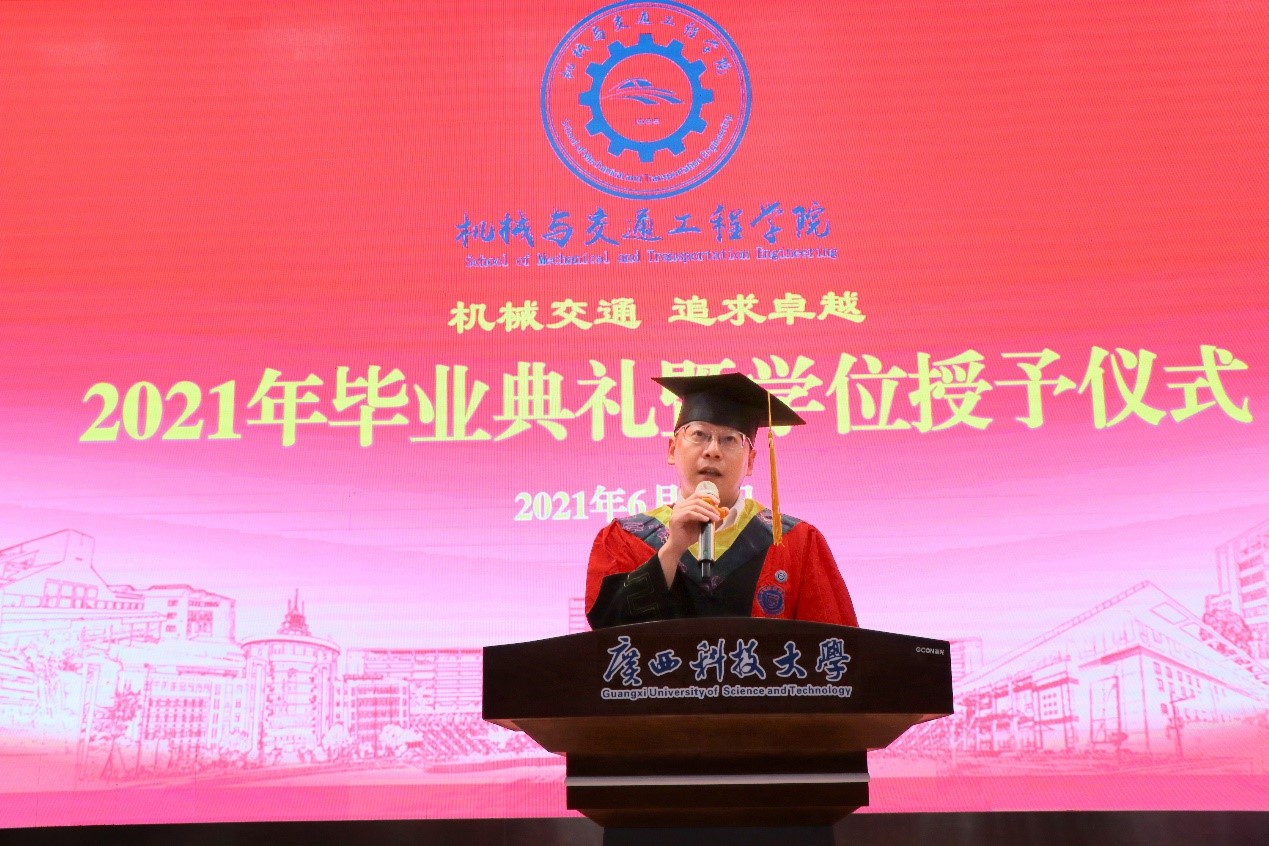 6月24日,机械与交通工程学院在柳东校区T1-303多功能报告厅隆重举行2021年毕业典礼暨学位授予仪式,学院党委书记卢丽虹,院长李健,党委副书记、纪委书记何敏,党委副书记刘湘桂,副院长尹辉俊、孙有平以及各系主任、教授代表、班主任、专兼职辅导员参加了本次活动,2021届本硕毕业生代表参加了活动。典礼和仪式由刘湘桂主持。