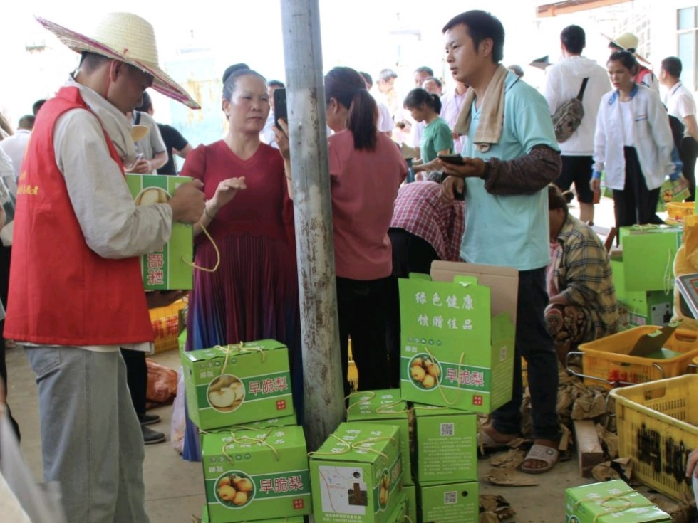除了教村民直播知识,实践队还积极参与当地重要活动,针对梨园的早脆梨销售进行直播。大家不惧高温酷暑,带上设备在现场直播、录制视频,并协助梨园装袋、打包、搬运等,得到了大家的好评。