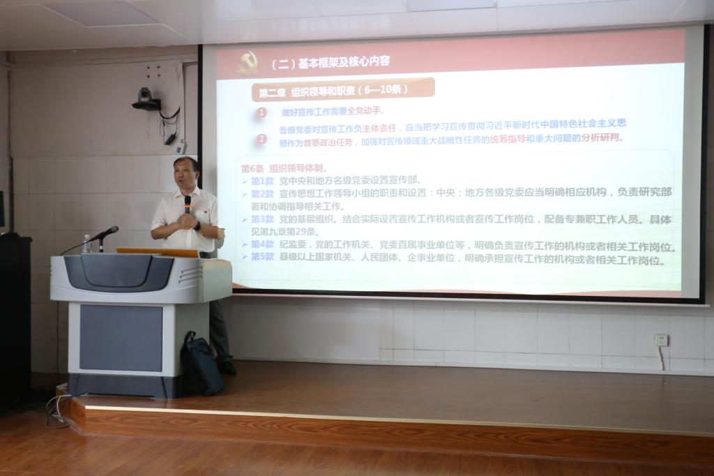 蔡亮从意识形态的内涵、习近平总书记关于意识形态工作的重要论述、当前意识形态工作取得的成绩和面临的形势与挑战及学好吃透《中国共产党宣传工作条例》、守牢意识形态主阵地等四个方面进行了深入浅出的阐述。在学好吃透《中国共产党宣传工作条例》精神,守牢意识形态主阵地的讲述中,蔡亮强调,有效应对意识形态领域面临的风险挑战,要将学习贯彻《中国共产党宣传工作条例》作为一项重要政治任务,在“长”“常”二字上下功夫,做到驰而不息、久久为功;要不断推动宣传工作实起来、强起来,确保党中央关于宣传工作的重大决策部署落到实处;要重视“人”的作用,加强宣传思想队伍建设工作。