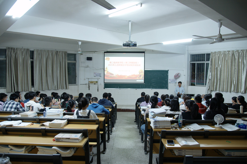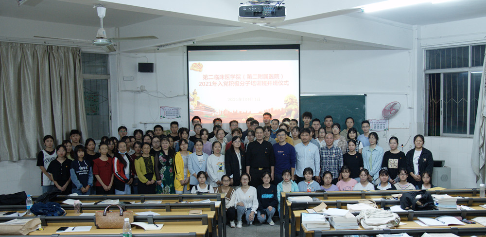 为切实做好入党积极分子的培养教育工作,提高入党积极分子的思想政治素质,10月11日晚,第二附属医院(第二临床医学院)2021年入党积极分子培训班开班仪式在箭盘教学点J-4教室隆重举行。院党委书记谭铁军、副书记胡耀文、党政办主任黄佩华以及本次培训班的各主讲老师参加开班仪式。学生党支部书记贾谦主持仪式,医院(学院)96名入党积极分子参加培训。