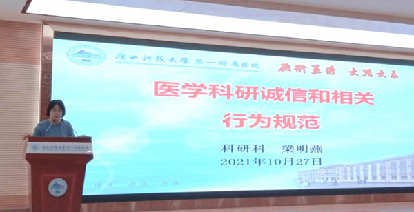 为进一步加强科研诚信建设、营造诚实守信的良好科研环境,10月27日下午,广西科技大学第一附属医院在学术报告厅举办了“医学科研诚信和相关行为规范”专题讲座。讲座由科研科梁明燕主讲,全院200多名职工参加。