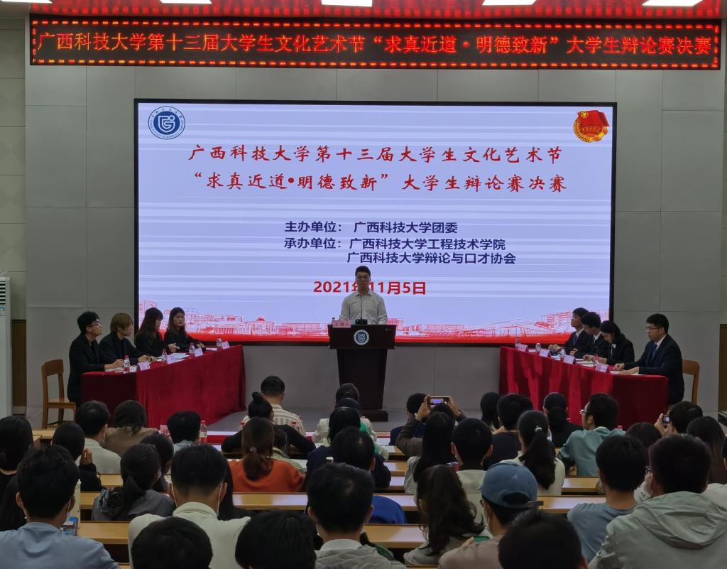 11月5日晚,我校第十三届大学生文化艺术节“求真近道·明德致新”大学生辩论赛决赛在东环校区图书馆报告厅举行。校团委副书记王湘林、各学院师生代表共计220余人观看了比赛。工程技术学院党委副书记、纪委书记何兴旭,校心理健康教育中心副主任熊少青,校团委校园文化部部长赖莹莹,理学院团委书记黄韬,外国语学院团委书记李慧慧担任比赛评委。