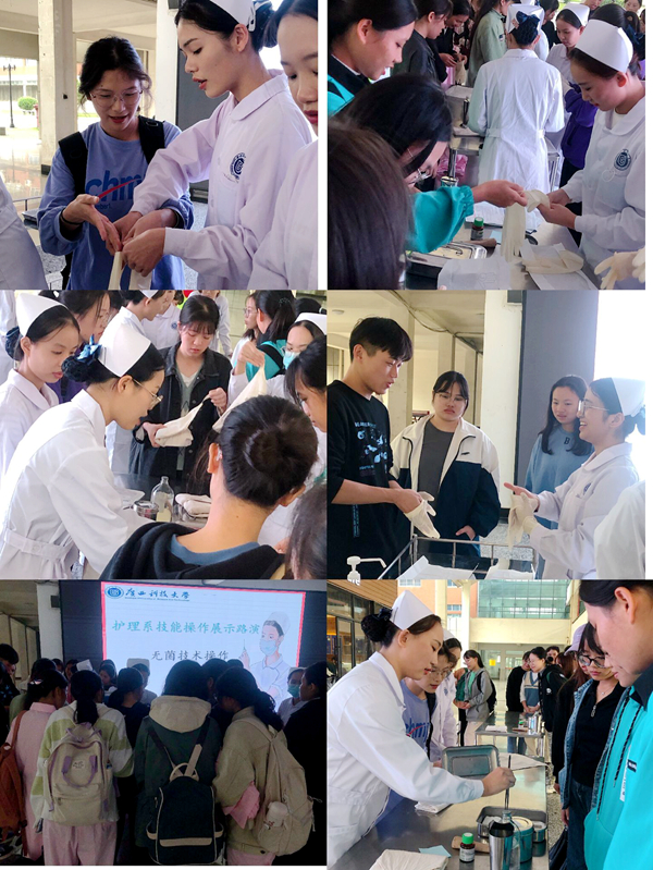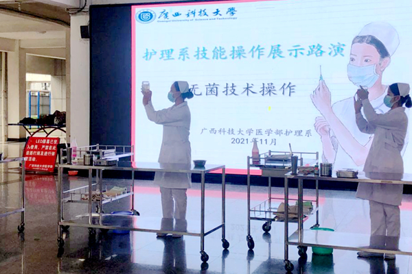 护理系技能操作展示路演于每周四下午16:30至18:00在柳石校区迎宾大道举行。展示队伍由各班级遴选出的技能操作能手组成,经专业教师组织强化培训后,通过公开进行操作展示、分解展示、现场互动教学的方式开展路演。路演第一期为护理196班的操作能手进行“无菌技术操作”展示,规范、娴熟、流畅的操作吸引了大批同学前来观摩学习。互动环节中,大家积极主动上前请教,学习热情高涨,久久不愿离去。活动现场形成了自主学、合作学、探究学的浓厚学习氛围。