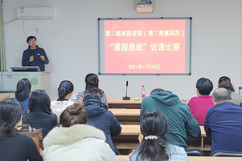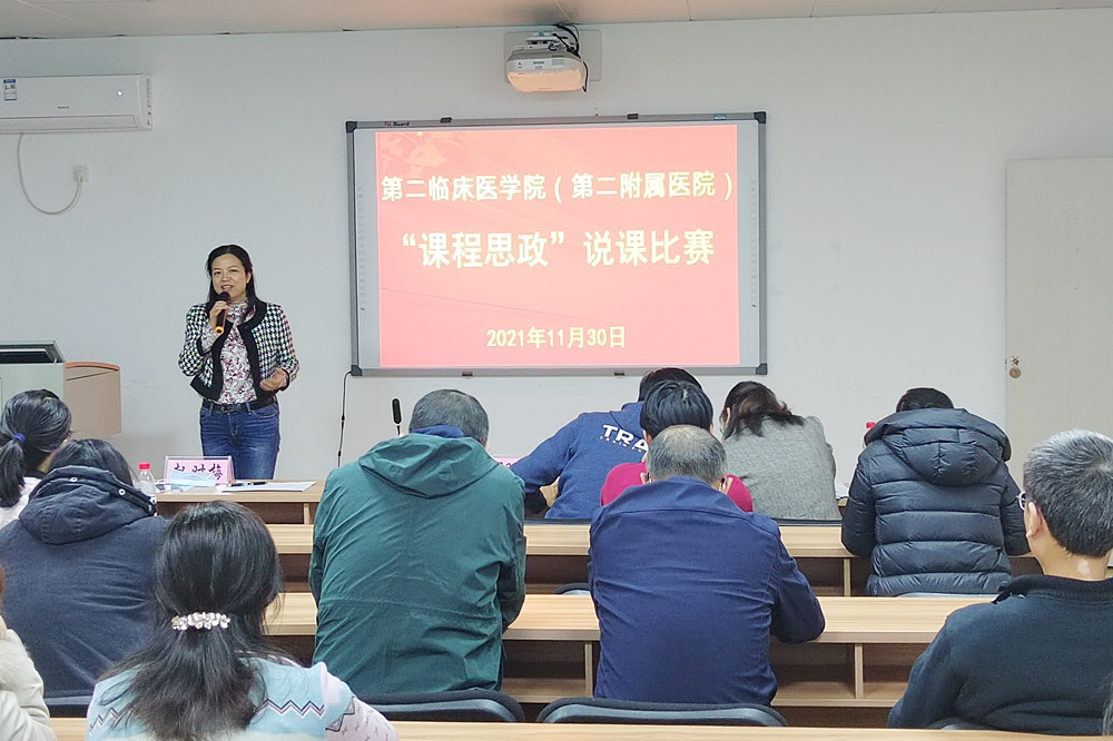 为扎实推进学院课程思政建设工作,强化教师实施课程思政的意识和自觉,提高教师课程思政教学设计和教学能力,11月30日晚上,广西科技大学第二临床医学院(第二附属医院)举办了首届“课程思政”说课比赛。院党委副书记胡耀文、副院长赵时梅、马克思主义学院课程思政指导老师宋强玲担任评委,学院全体教师和附属医院参与临床教学教师现场观看了比赛。