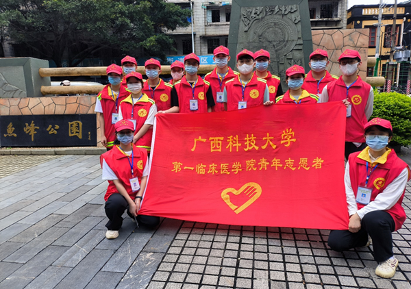 5月22日,广西科技大学第一临床医学院青年志愿者协会社区服务小分队走进柳州市鱼峰公园,开展“喜迎二十大、永远跟党走、志愿奉青春”鱼峰公园清扫活动。