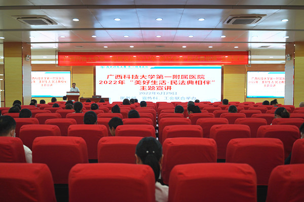 为进一步加强广大医务工作者的法律意识,提升全体教职员工的法律素养,在全院上下营造学法、用法的良好氛围,用更良好的法律道德意识为患者提供优质服务,6月29日下午3点,广西科技大学第一附属医院在学术报告厅举办2022年“美好生活·民法典相伴”主题宣讲活动,邀请到医院法律顾问、广西超仁律师事务所专职律师高山为大家授课。副院长张施明出席会议,各职能科室及临床、医技医务人员100多人参加活动。活动由宣传科负责人辜丽娜主持。