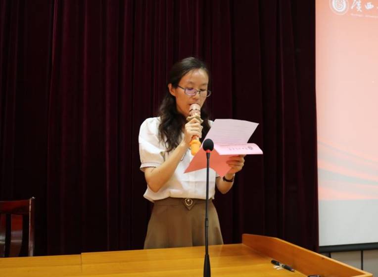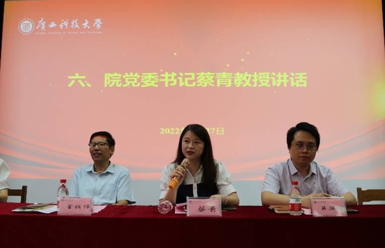蔡青教授对全体研究生新生致以衷心祝贺和热烈欢迎。她从学院概况、办学特色、培养条件、学生发展等方面为新生进行了详细介绍。她希望同学们志存高远,不仅要多读书,丰富专业知识,打造综合技能,还要多感悟,坚定人文精神,更要全方位的提升人文素养,能够求得真学问、练就真本领;期待同学们秉承校训、追求卓越;祝愿同学们健康生活、快乐学习,在广西科技大学留下美好的青春记忆。