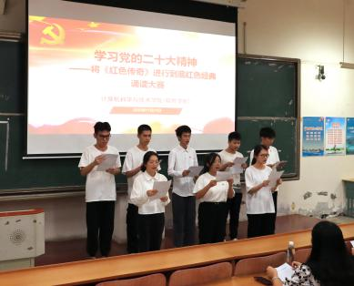 11月11日晚,计算机科学与技术学院(软件学院)在第五教学楼北203教室举办“学习党的二十大精神——将《红色传奇》进行到底”红色经典诵读比赛,学院党委书记刘莉莉及学院部分辅导员参加本次活动,来自学院各党支部的学生党员及入党积极分子共组成9支队伍参加比赛。
