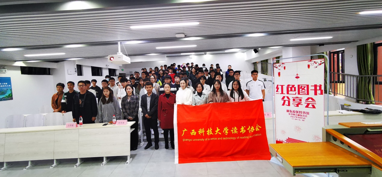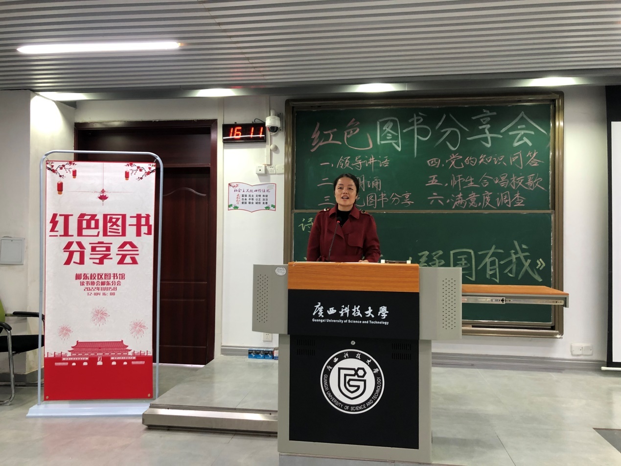 为传承红色基因,弘扬爱国精神,11月15日下午,图书馆在柳东校区T2-104教室举办“追寻红色足迹,分享红色图书”读书分享会。图书馆党总支书记、馆长薛宏珍,机械与汽车工程学院辅导员徐光香、古思敏,读书协会柳东分会指导老师周拓,图书馆老师代表,读书协会柳东分会会员及汽服Y211班全体同学等110余人参加了活动。活动由交通Y221班覃彬彬主持。