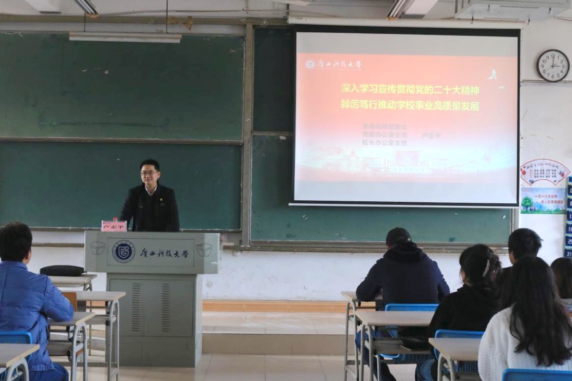 12月6日下午,在文昌校区第四教学楼4C502教室,学校党委常委、统战部部长、党政办主任卢志平教授,以《深入学习贯彻党的二十大精神,踔厉笃行推动学校事业高质量发展》为题,宣讲党的二十大精神,经管学院工商211班、信管211班全体同学聆听了本次宣讲。
