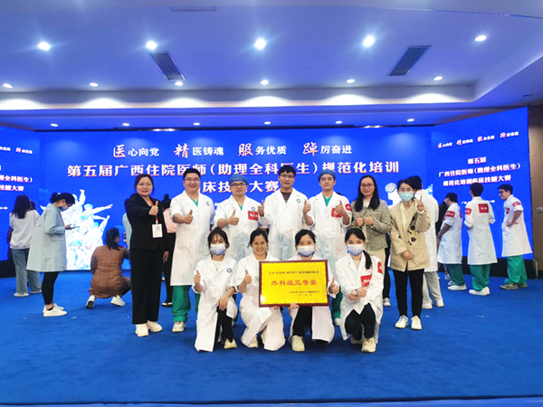 第五届广西住院医师(助理全科医生)规范化培训临床技能竞赛,于2023年3月2-4日在广西壮族自治区人民医院举行。本次竞赛由自治区卫生健康委主办,广西壮族自治区人民医院承办。来自全区26个住培基地、27个助理全科医生培训基地,共101支参赛队伍参加了比赛。其中内科组23队、外科组25队、全科组26队、助理全科27队。大赛的主题是“医心向党,精医铸魂,服务优质,踔厉奋进”。竞赛共设一等奖2名,二等奖2名,三等奖4名。