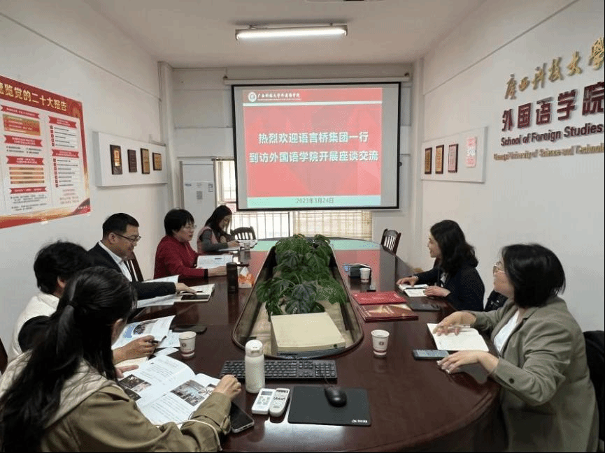 为推动产学研协同创新,寻求校企合作共赢、共谋发展的良好局面,3月24日下午,语言桥集团昆明子公司的吕毅总经理和马蕊经理一行莅临外国语学院洽谈校企合作。外国语学院党总支书记陈志波、院长周柳琴、副院长周桂香、MTI教育中心主任谭玮博士以及教师代表左海清博士参加了座谈会。