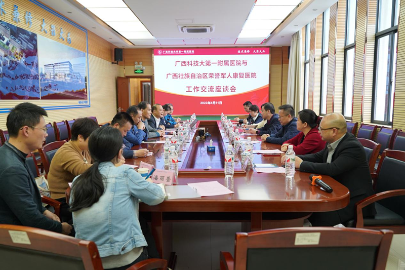 4月11日,广西荣誉军人康复医院到我校第一附属医院进行工作交流。广西荣誉军人康复医院党总支书记、院长李强,医院业务副院长郑晓波带队前来,我校第一附属医院党委书记庞晓红、党委副书记院长覃天等院领导及相关科室负责人接待来访。双方就共建医联体工作进行了深入地交流。