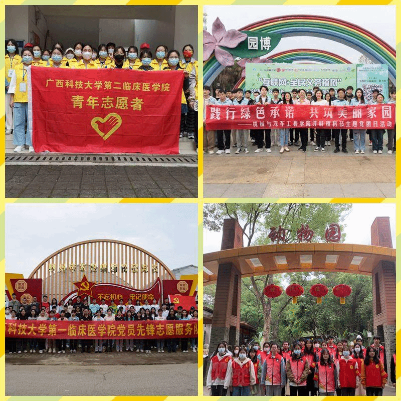 各学院(部)充分发挥党团组织和学生组织的作用及优势,结合学院实际情况,举办形式多样的主题校园文化活动。医学部组织在校学生观看教育片《榜样7》,学习基层工作者数十年如一日的劳动精神,工匠精神。机械与汽车工程学院积极响应柳州广播公益植树活动的倡议开展“践行绿色承诺 共筑美丽家园”植树节主题党团日活动,组织40余名机械汽车师生志愿者在园博园种下一抹春天的青绿。电子学院结合柳州创城工作,组织学院青协前往柳州市园博园、敬老院等,进行卫生打扫,垃圾分类等志愿服务。