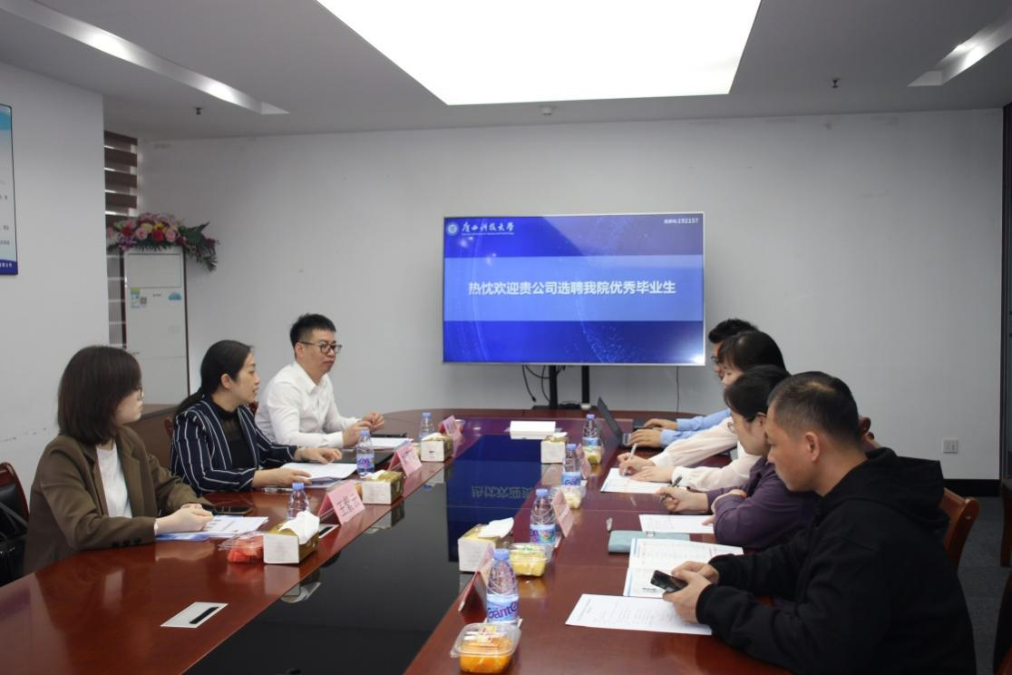 在观看企业方的简介视频后,刘莉莉与企业人员对企业主营业务、未来发展方向及实习生的管理和培养进行了深入的交流和探讨,表达了对校企双方深入推进校企合作的信心和期待。黄剑华向企业方介绍了学院的专业设置、办学规模、师资队伍、科学研究、人才培养等情况,欢迎企业选聘学院优秀毕业生。
