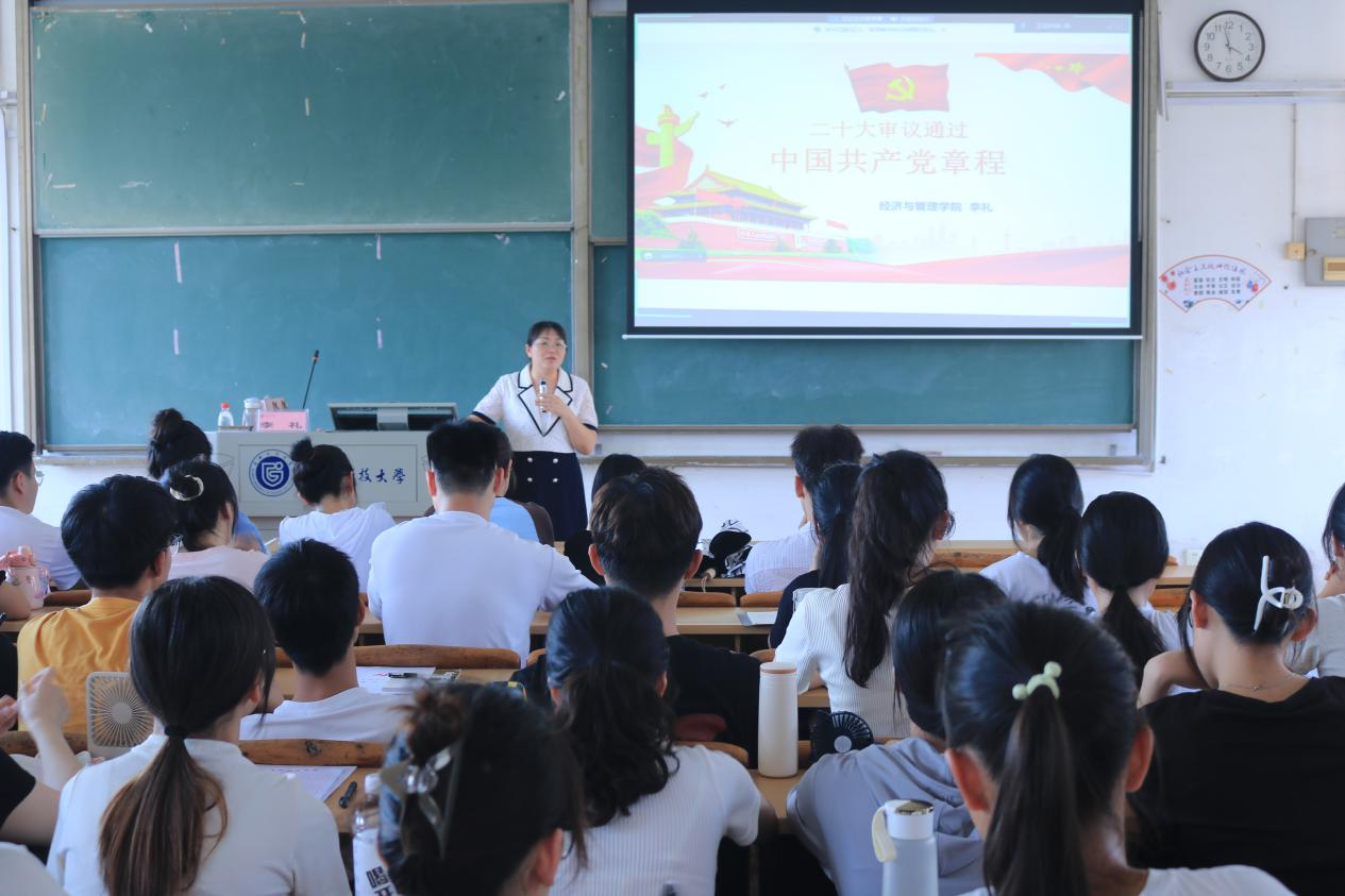 学院工商管理系教工党支部书记李礼讲授党课《中国共产党章程》《社会主义核心价值体系》。李礼分别从“党的二十大对党章作出了哪些修改”“党章发展的历史进程”“学习贯彻党的二十大精神”三个方面展开讲授,重点围绕《中国共产党章程》修订的内容进行深入剖析,全面系统地学习了党的二十大审议通过的最新《中国共产党章程》。围绕“中国共产党为什么能”“中国特色社会主义为什么好”两个方面,详细介绍《中国共产党章程》发展的历史进程,展示了中国共产党不断总结党的建设历史经验,不断提高党的建设科学化水平的伟大历程。李礼希望大家坚持从实际出发,在“学懂”“弄通”“做实”上下功夫,全面学习贯彻党的二十大精神,内化于心,外化于行,为实现第二个百年奋斗目标、实现中华民族伟大复兴的中国梦而不懈奋斗。