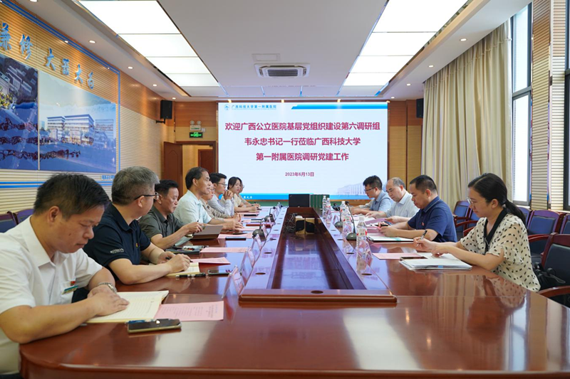 6月13日上午,广西公立医院党建工作指导委员会第六调研组组长韦永忠带队到广西科技大学第一附属医院开展广西公立医院基层党组织建设调研。医院党委书记庞晓红、党委副书记何曲波以及党办主任、专职组织员、各党支部书记参加调研。