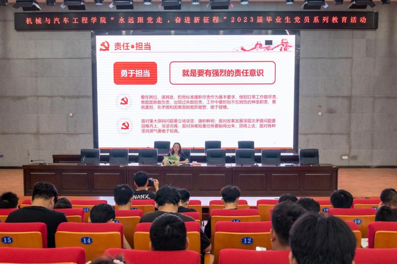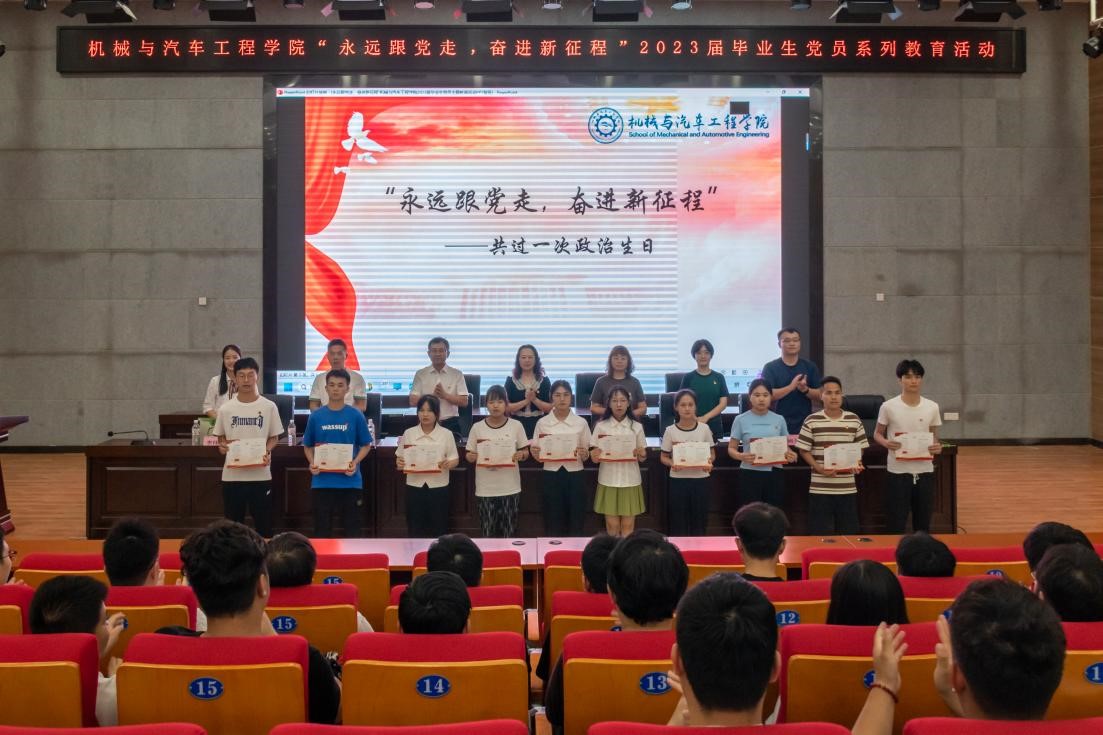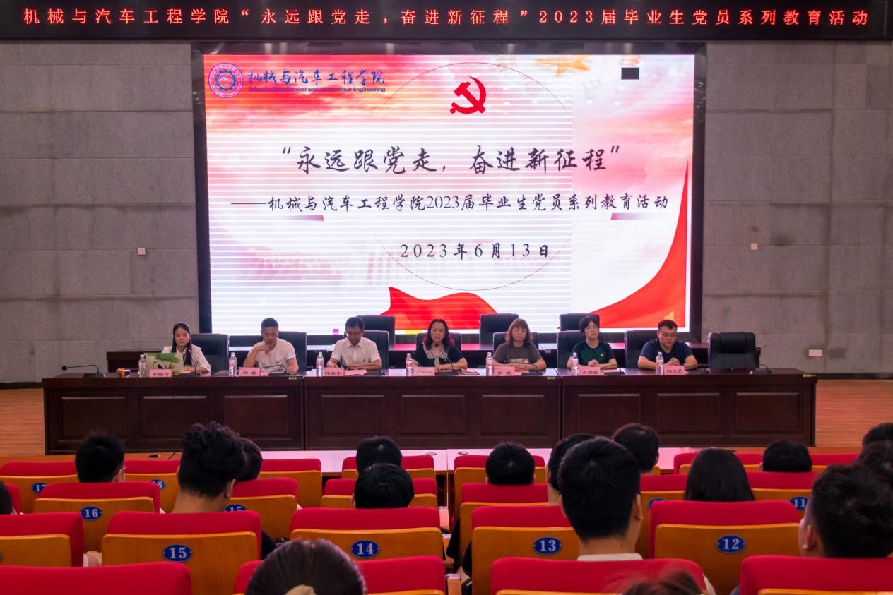 6月13日下午,机械与汽车工程学院党委在柳东校区多功能报告厅举行2023届毕业生党员“永远跟党走,奋进新征程”为主题的系列教育活动。学院党委书记卢丽虹、副院长孙有平、专职组织员、各党支部书记以及2023届本科、研究生毕业生党员参加了活动,活动由学院党建工作负责老师李伟青主持。