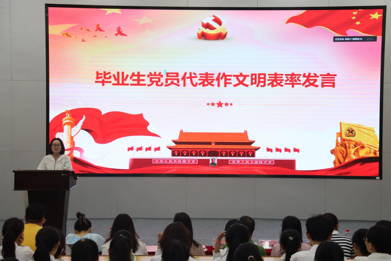 毕业生党员代表人力资源管理专业学生党支部秦丽萍作文明表率发言,国际经济与贸易专业学生党支部欧阳琰琰为学弟学妹们分享毕业临别寄语,低年级党员们纷纷向毕业生党员送上了美好祝福。