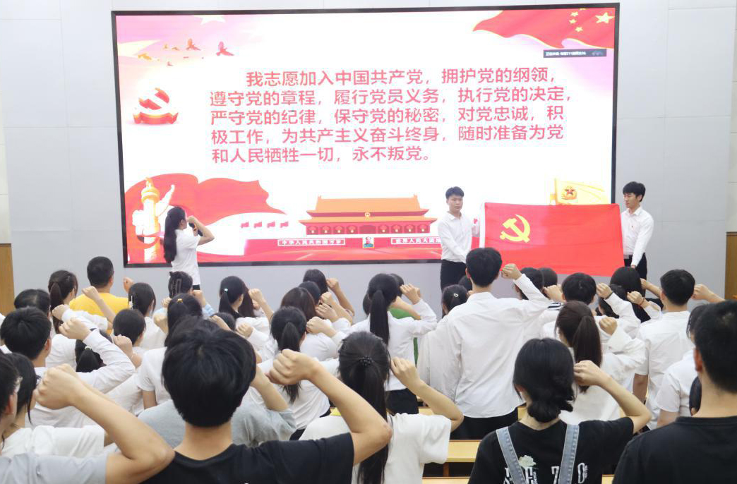全体党员在庄严的党旗下重温入党誓词。党员们面向党旗,举起右拳,庄严宣誓,进一步坚定入党初心和为共产主义事业奋斗终身的决心。