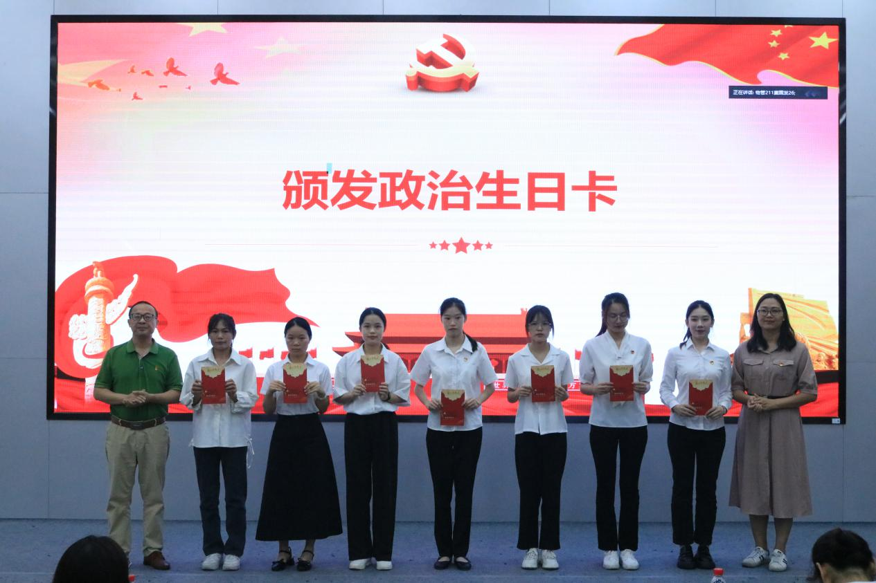 莫勤德、韦齐齐为毕业生党员颁发政治生日卡,全体党员共同度过了一次政治生日。
