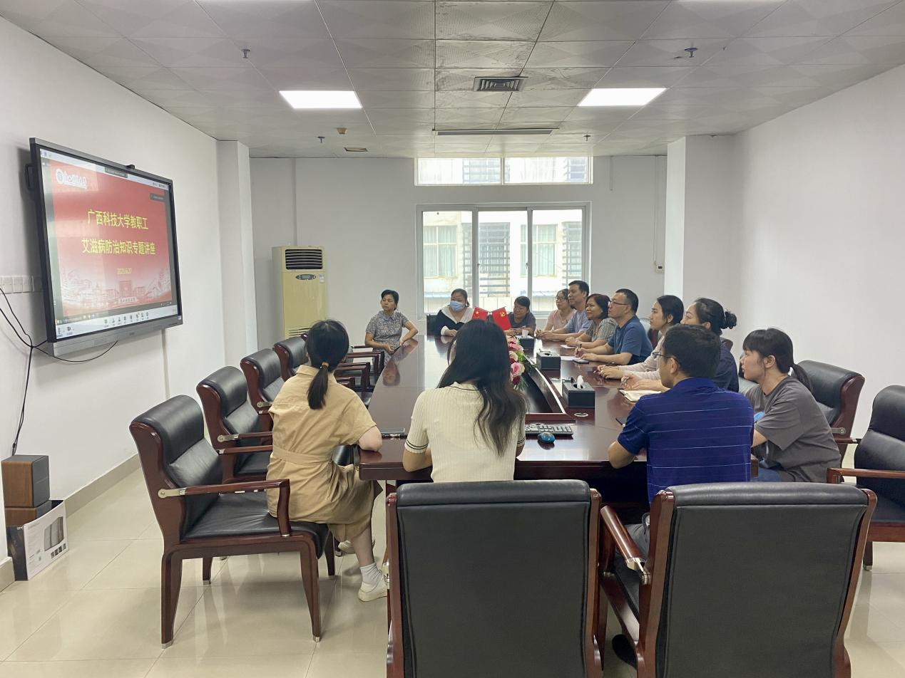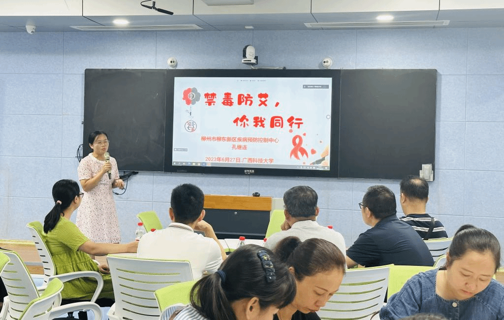 为深入实施我校“师生健康、中国健康”主题健康教育活动,帮助教职工深入了解艾滋病预防知识和提升自我保护意识,营造全社会参与艾滋病防治工作的良好氛围,6月27日下午,柳州市柳东新区疾控中心副主任孔继连受邀在文昌校区第四教学楼4D203智慧教室举办了“禁毒防艾,你我同行”的专题讲座。讲座采用线下线上两种方式,全体教职工共同聆听了本次讲座。