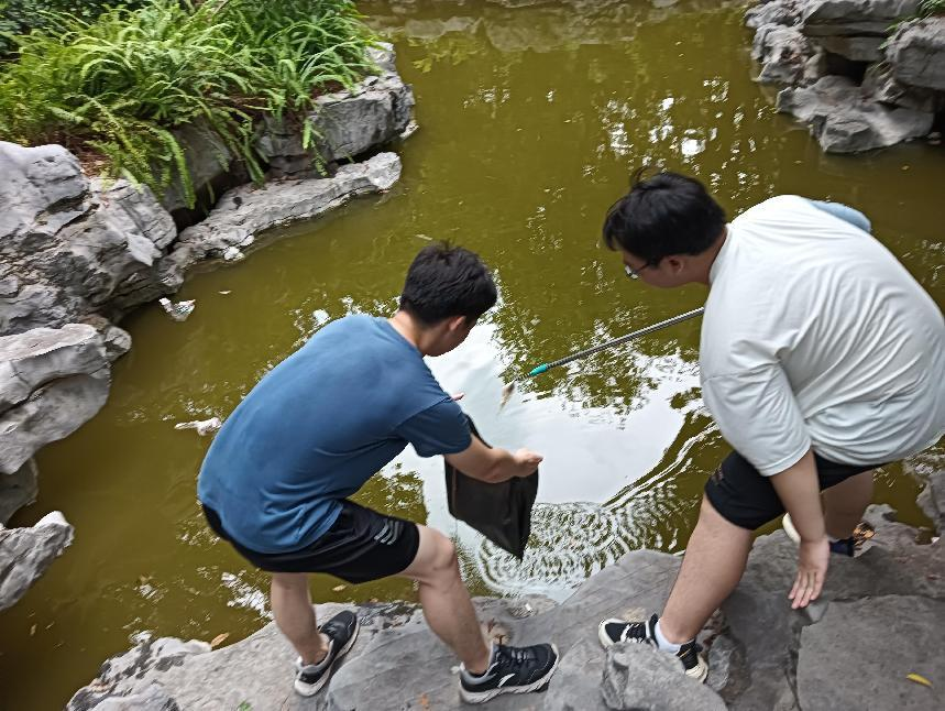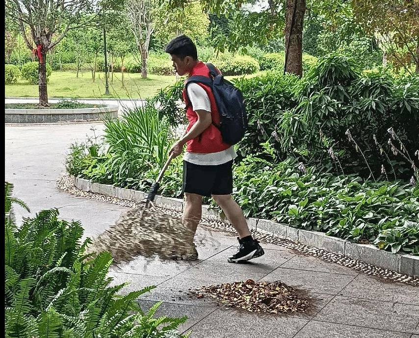 活动开始时,虽阴雨绵绵,却丝毫不减大家的热情。大家在工作人员的带领和指导下,一双双手不停地忙碌着,挥舞着扫把,清扫道路上的落叶,用夹子把藏在草丛中的白色垃圾夹出,并装进垃圾袋。同学们的辛勤劳动获得了公园管理人员和游客的好评。