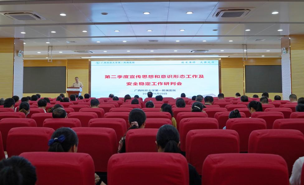 6月29日,广西科技大学第一附属医院(第一临床医学院)在医院学术报告厅召开了2023年第二季度宣传思想和意识形态工作及安全稳定工作研判会。医院(学院)党委书记庞晓红作主题研判,党委委员、副院长闭雄杰总结分析了第二季度安全工作,全体院领导、全体中层干部、护士长共150多人参加会议。