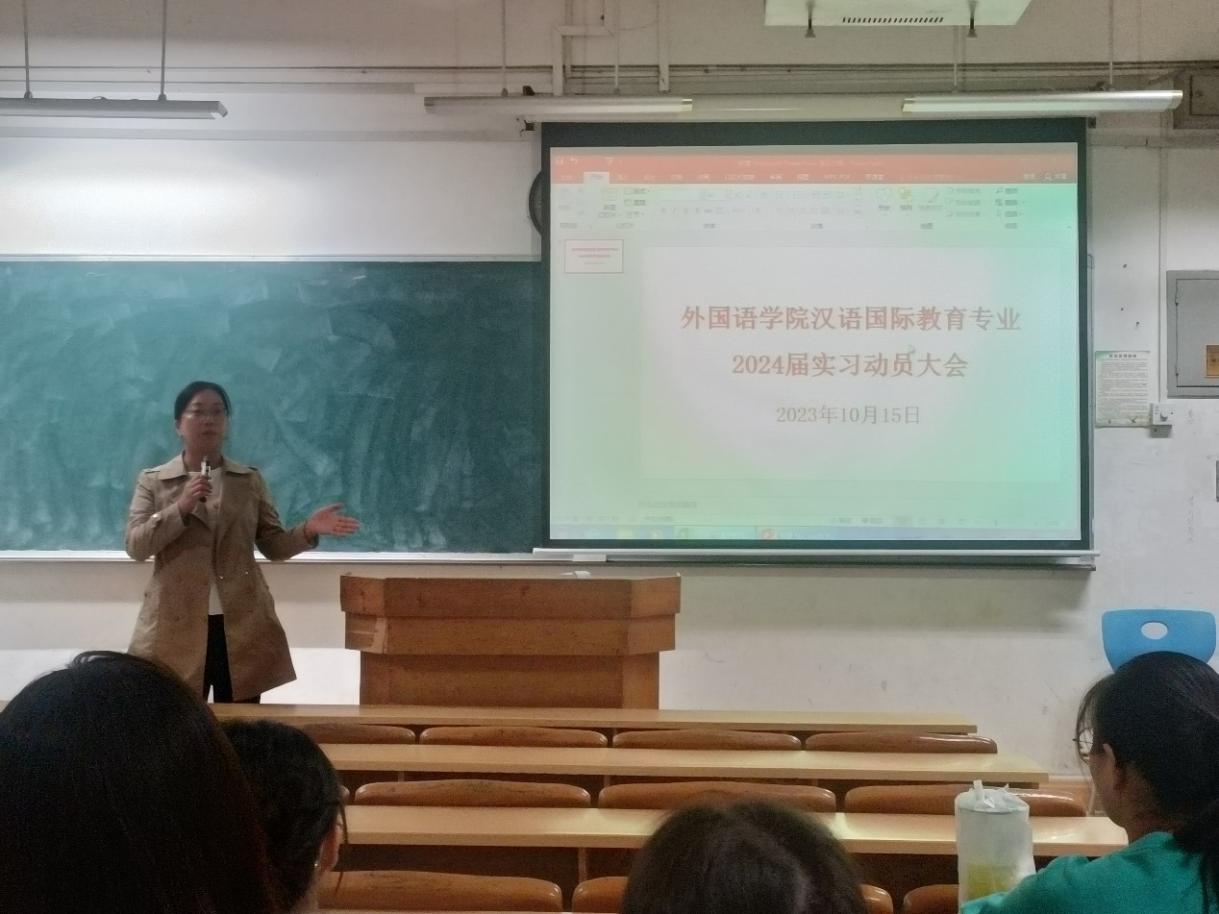 10月15日晚,外国语学院在4A101教室召开汉语国际教育专业2020级学生实习动员会,汉语国际教育专业负责人易丹、教研室主任兼汉语201班班主任林业锦以及汉语国际教育201班全体学生参加会议。