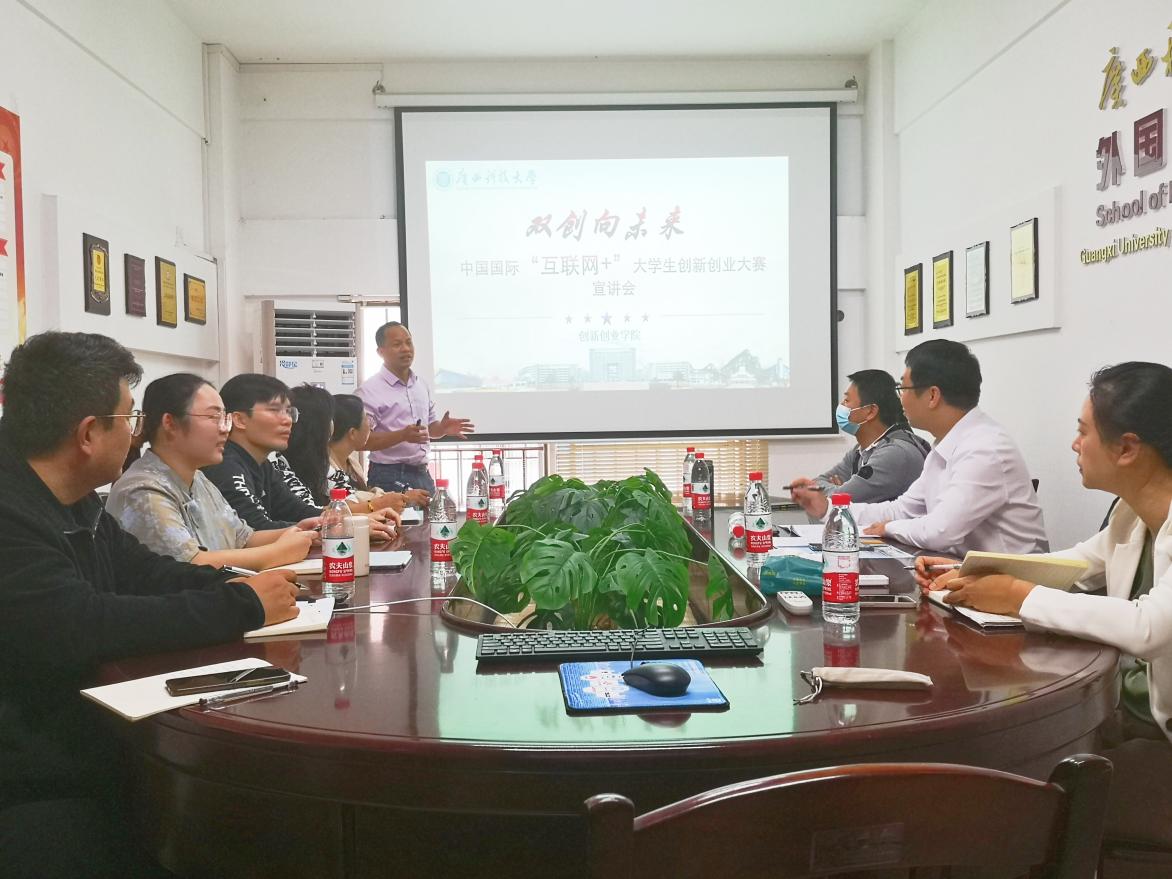 10月20日下午,外国语学院在文昌校区第四教学楼4B502会议室召开了一场关于"互联网+创新创业大赛"的专题培训会。学校创新创业学院院长文家燕、副院长姜峰,互联网+大赛金奖获奖团队负责人崔津华,外国语学院党委书记陈志波、副院长谭玮出席,外国语学院各教研室教师代表和参赛团队的指导教师参加。培训会由陈志波主持,文家燕担任主讲。