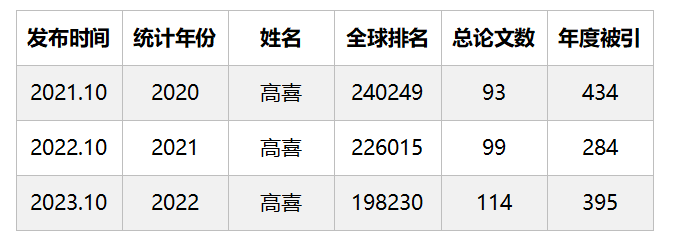 据悉,高喜教授自2021年起连续3年入选”全球前2%顶尖科学家榜单”,且其在全球排名逐年上升2万多位。
