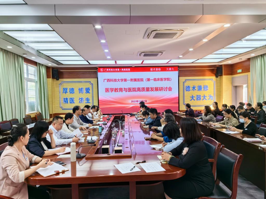 12月7日,为着力提升医教研融合水平,深化医教研融合发展,推进医学教育与医院高质量发展,我校第一附属医院(第一临床医学院)召开了医学教育与医院高质量发展研讨会。医院(学院)党委书记庞晓红,党委副书记、院长覃天及党政领导班子和部分职能科室负责人、大内科、大外科主任等参加了会议。研讨会由副院长黄进瑜主持。