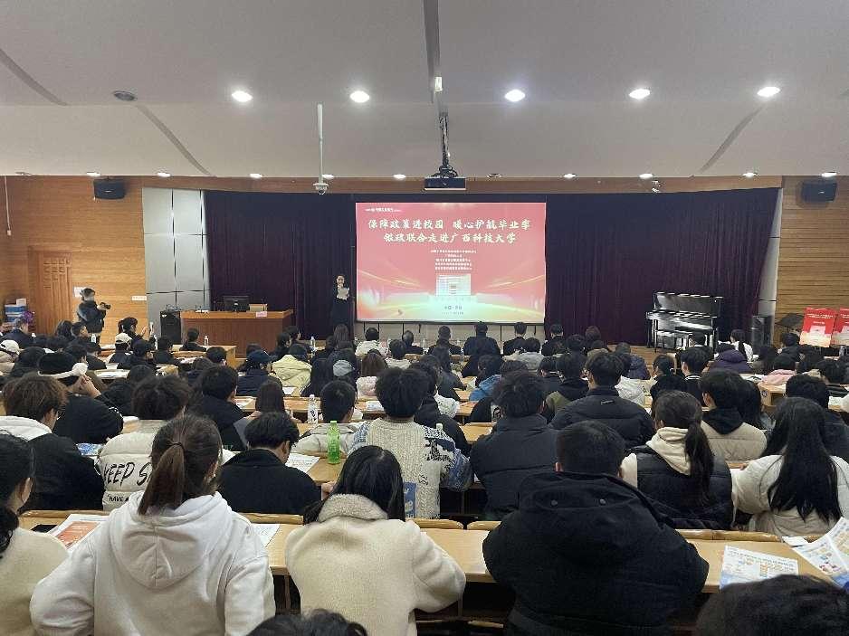 为进一步在学生中加强社会保障政策和金融知识的普及率和覆盖面,帮助学生毕业后顺利就好业、安好居,12月26日下午,学校联合中国工商银行股份有限公司柳州分行、柳州市住房公积金管理中心、柳州市社会保险事业管理中心、柳州市医疗保障事业管理中心在文昌校区第四教学楼4阶4教室举办“保障政策进校园 暖心护航毕业季 银政联合走进广西科技大学”宣讲活动。我校学工部(处)部(处)长陈克文、计财处副处长曹涛,各单位负责人、辅导员以及学生代表共计300余人参加活动。