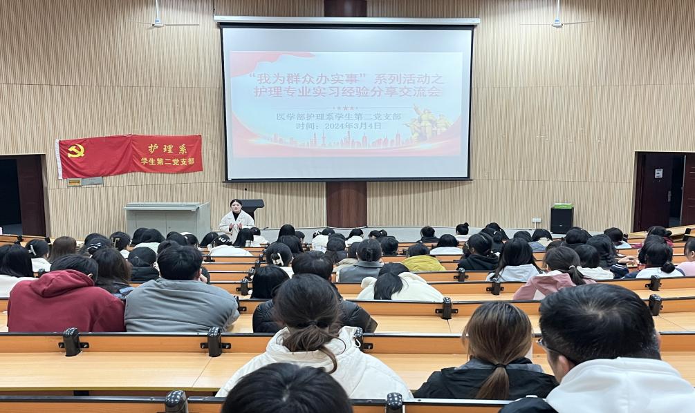 为进一步发挥学生党员的先锋模范作用,增强党员的志愿服务意识和能力,3月4日晚,医学部护理系学生第二党支部在柳石校区第一报告厅举办“我为群众办实事”系列活动之护理专业实习经验分享交流会。医学部护理系党总支副书记郭钰婷,护理系学生第二党支部党员及护理专业部分学生参会,活动由护理系学生第二党支部书记韦星安主持。